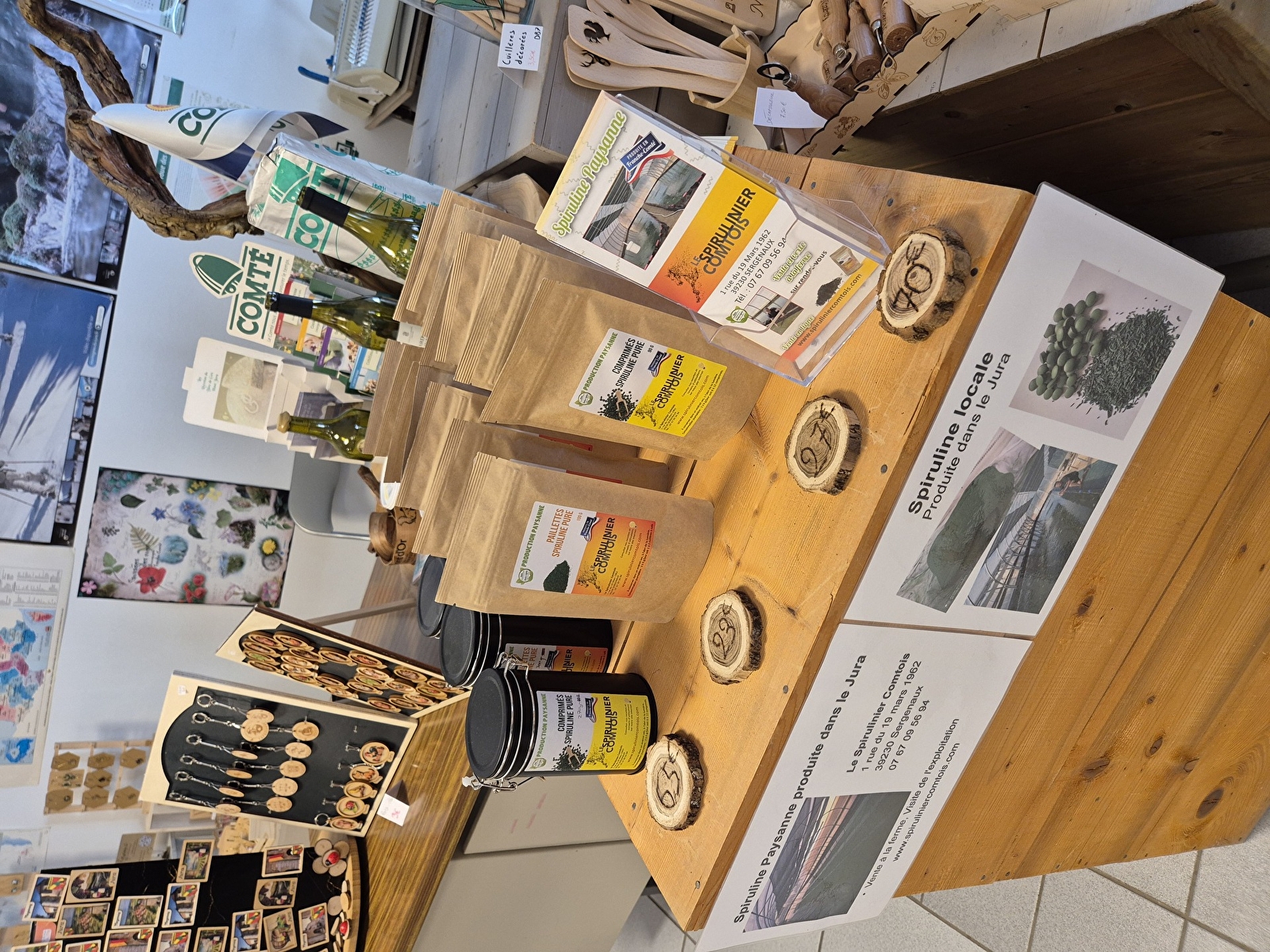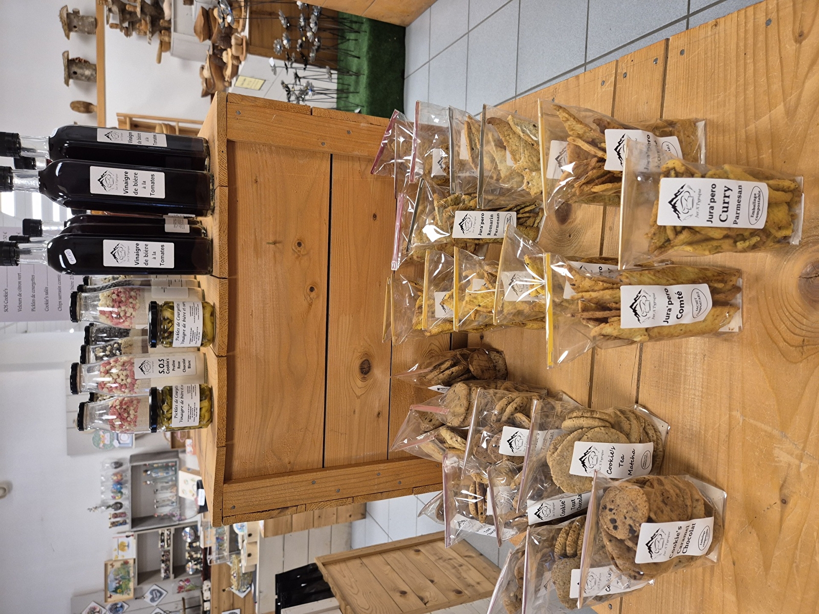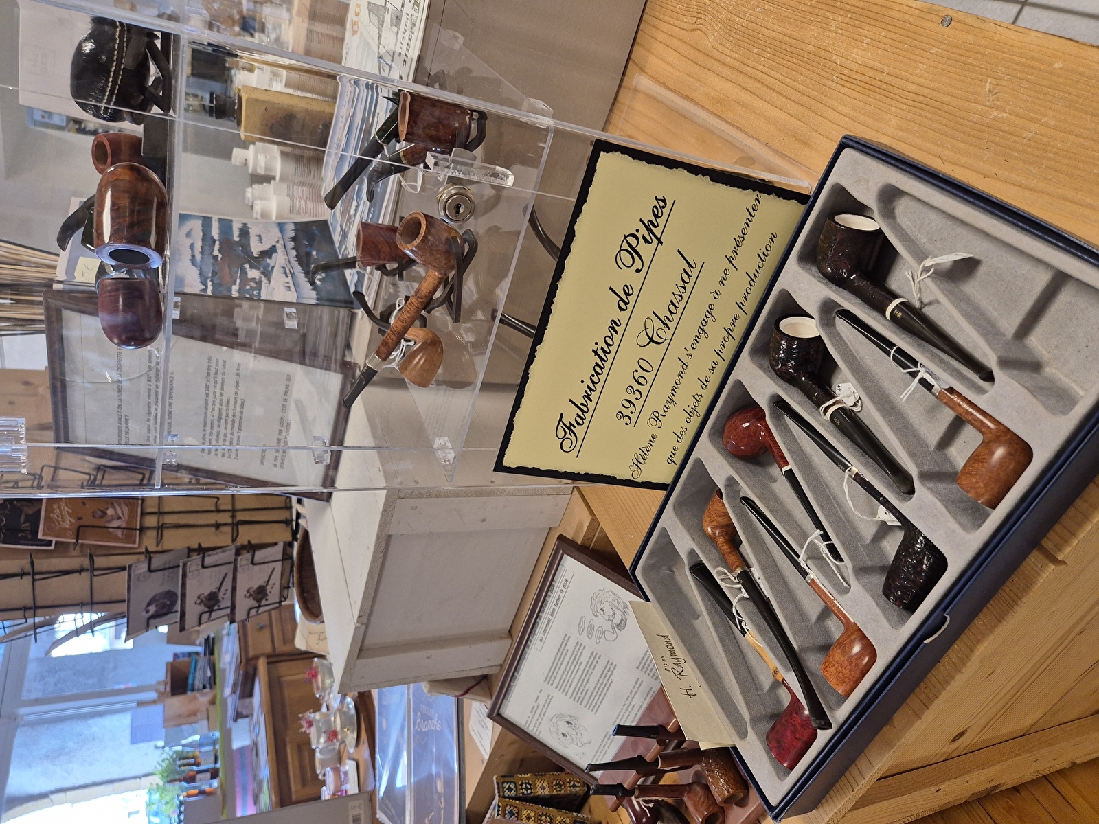 Dat is het concept achter de winkel, die een grote verscheidenheid aan voorwerpen tentoonstelt, maar die allemaal één ding gemeen hebben: ze zijn allemaal gemaakt door een ambachtsman uit de Jura, of dat nu een draaier, pottenbakker, emailleur, lapidair of glasblazer is. Dus... een houten speeltje, een geëmailleerd juweel, een pijp of een leren tas? Maar je kunt ook vallen voor een lekkernij, zoals deze jam van abrikozen en basilicum (heerlijk!), of dit potje gekonfijte Vin Jaune...