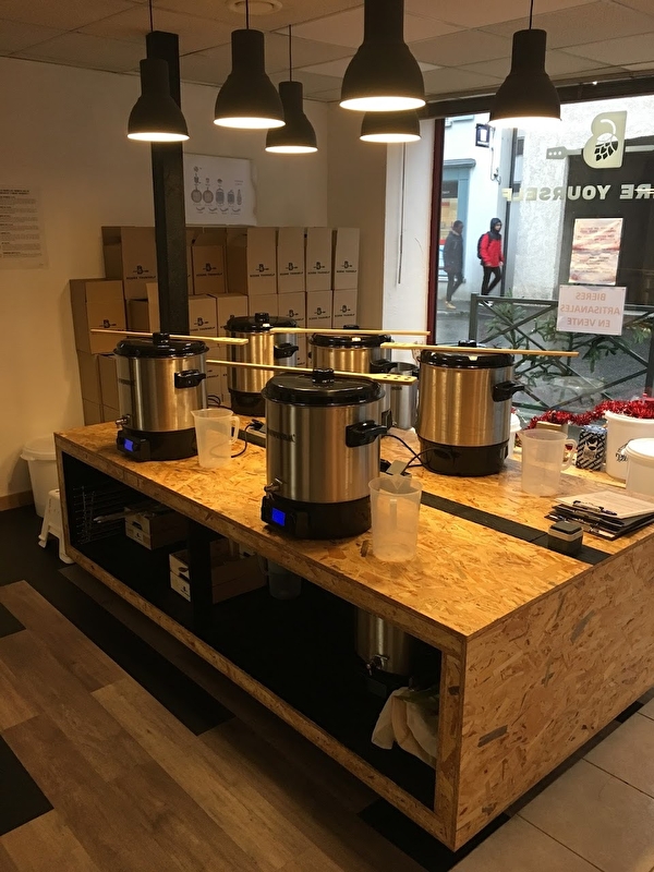 Nadat u uw favoriete bier uit het receptenboekje hebt gekozen, brouwt u uw eigen bier, van het malen van het mout tot het bottelen, en vertrekt u met 20 flessen (10 liter). Maxime deelt graag zijn waardevolle brouwtips en kan zijn workshops geven in het Frans, Engels of Spaans.