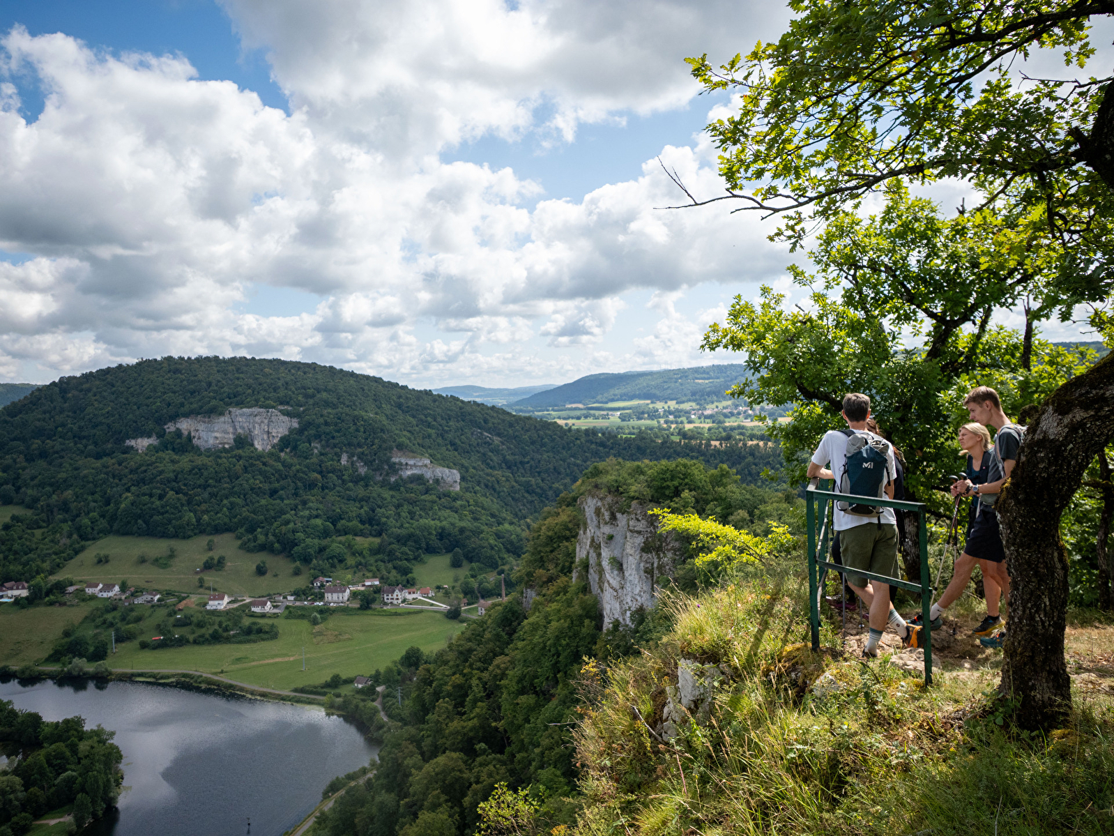 Een route langs het water en over de bergkammen met het uitzichtpunt van het Croix de Châtard. Vanaf hier zie je de oude pijpenfabriek Ropp, het oude dorp Cour, de Baume en zijn heuvels... De Doubs stroomt beneden, tussen de Fente de Babre en de rotsen van Sous-Buen, en vormt het stroomgebied van de Gondé.
