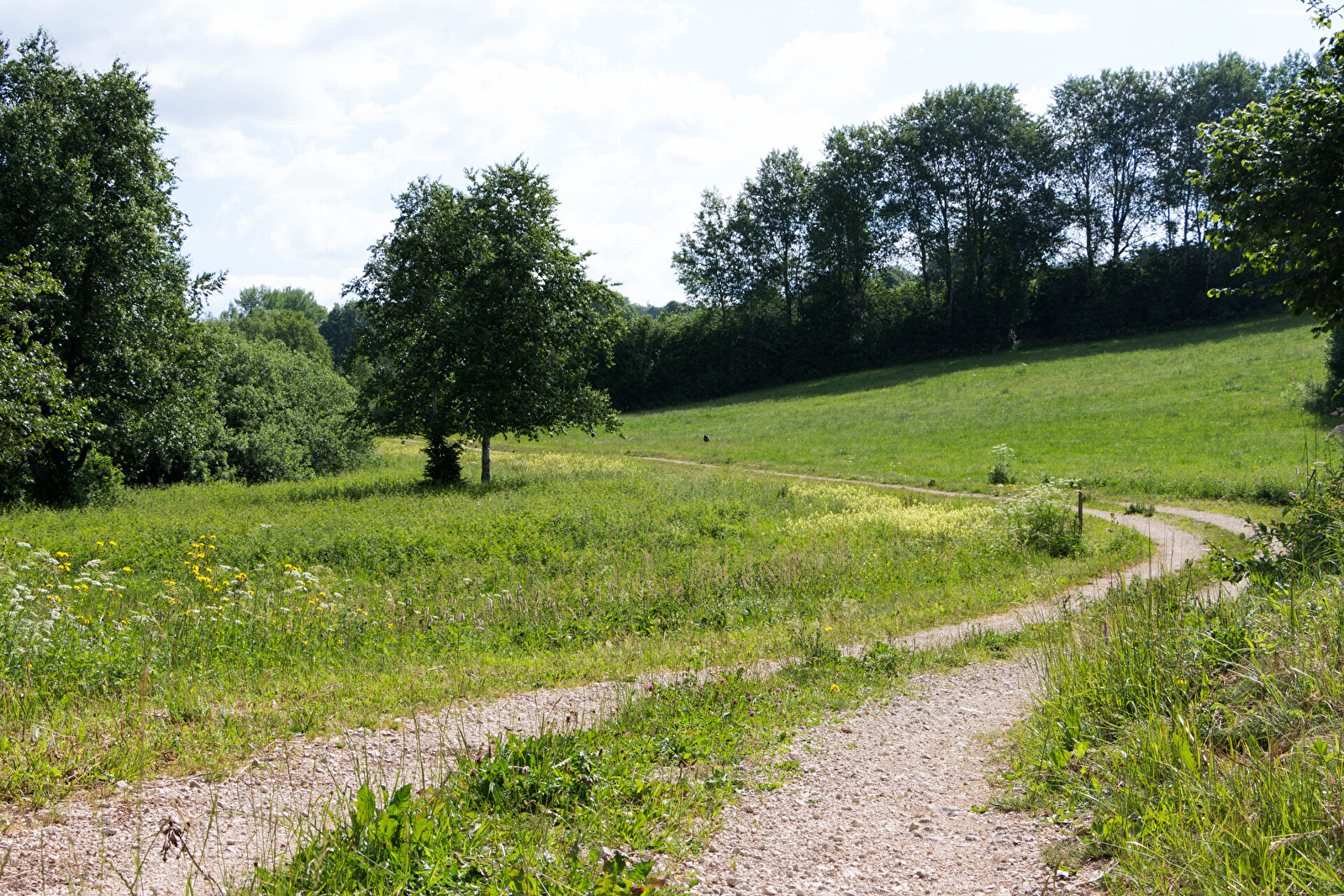 Volg de weg naar rechts en vervolgens een hellend pad naar de heuvelrug bij de post La Corne. In het weiland gaat u rechts omlaag om een hek te passeren en een wit pad te volgen.