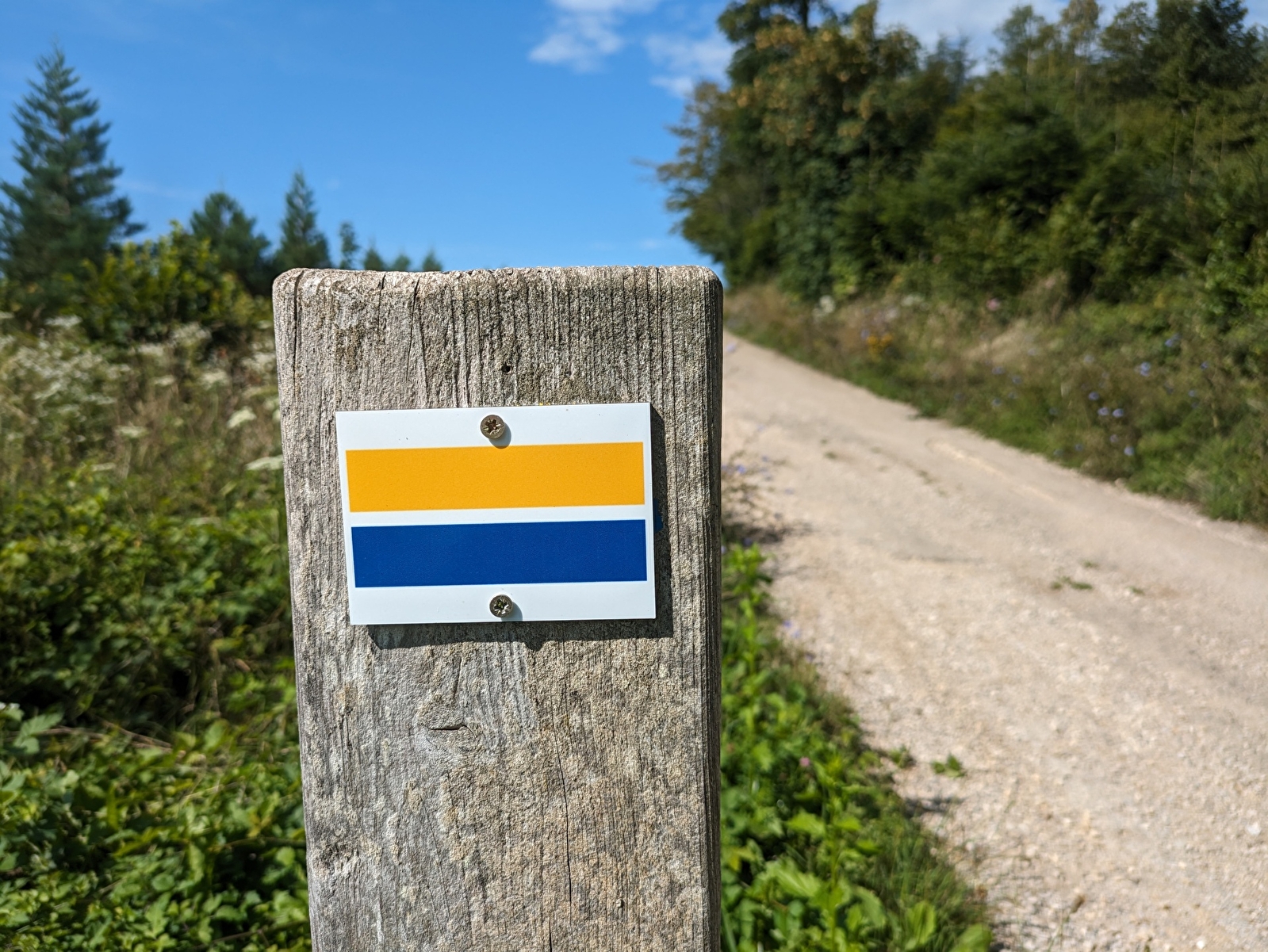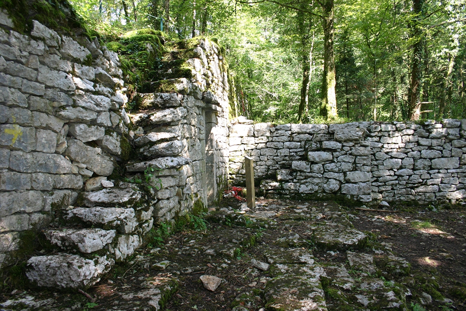 STAP 5: Keer terug naar het grindpad en net voor de jachtparking vind je een prachtig uitkijkpunt over de vallei en de hoogten van Baume-les-Dames. Verlaat de Chemin de la République en volg een pad met de aanduiding "Sentier découverte" (ontdekkingspad) dat je naar de steengroeve brengt.