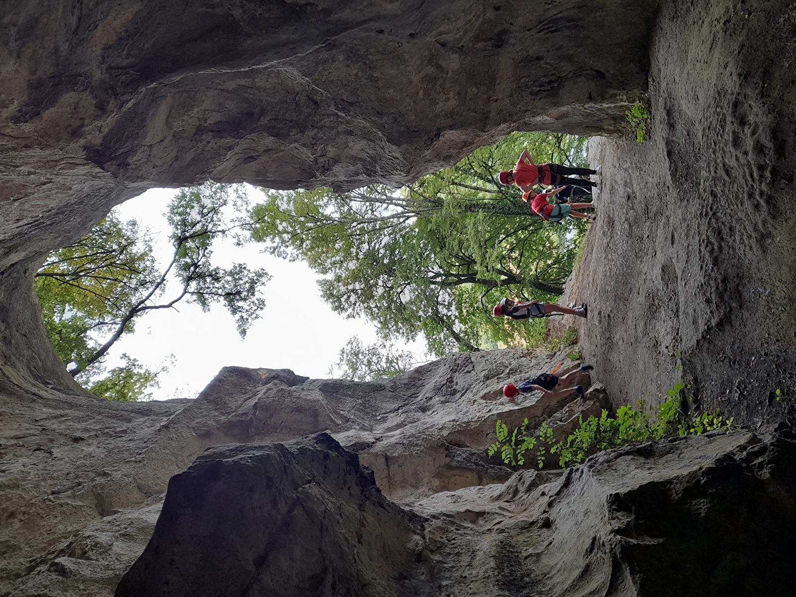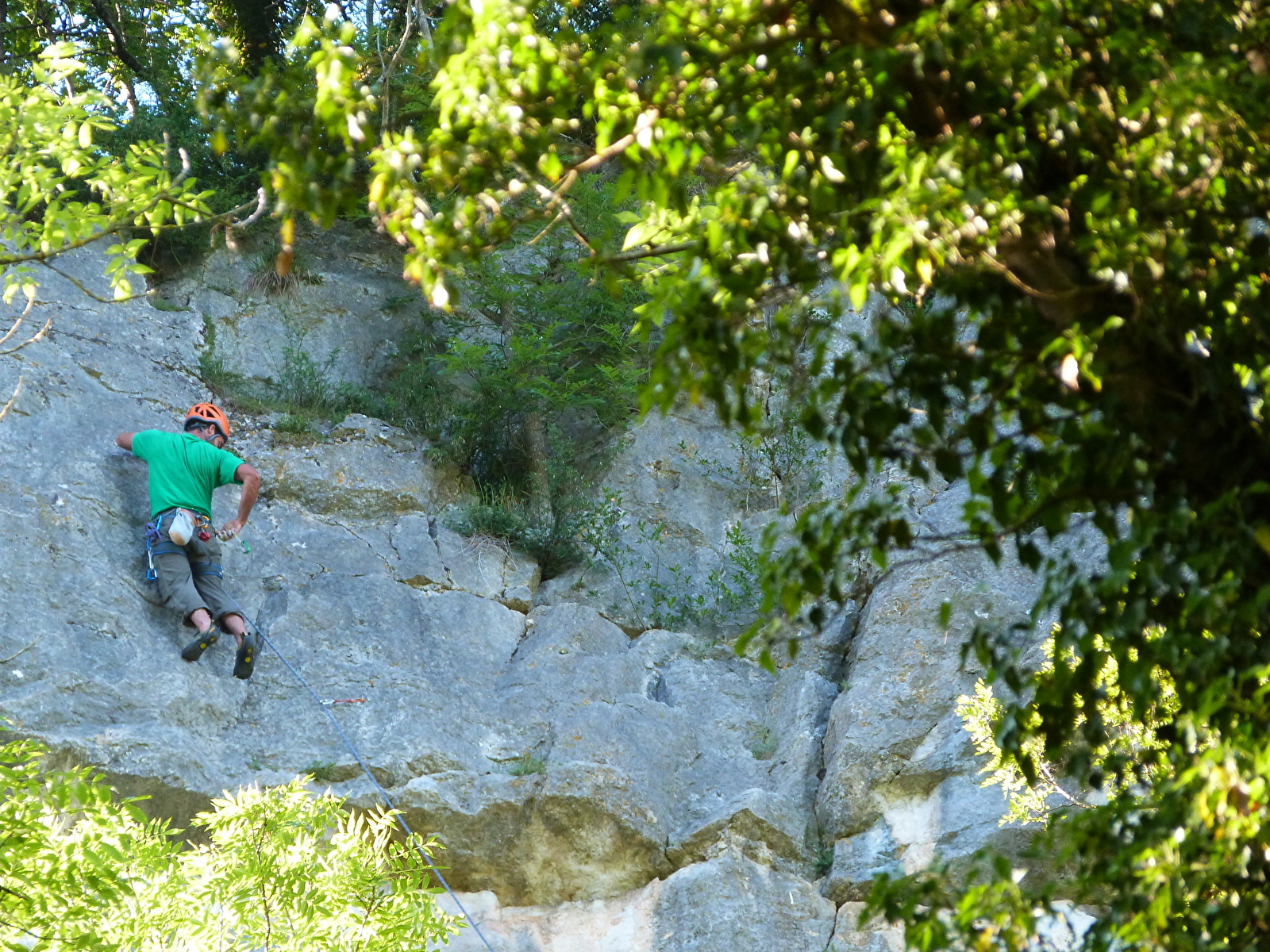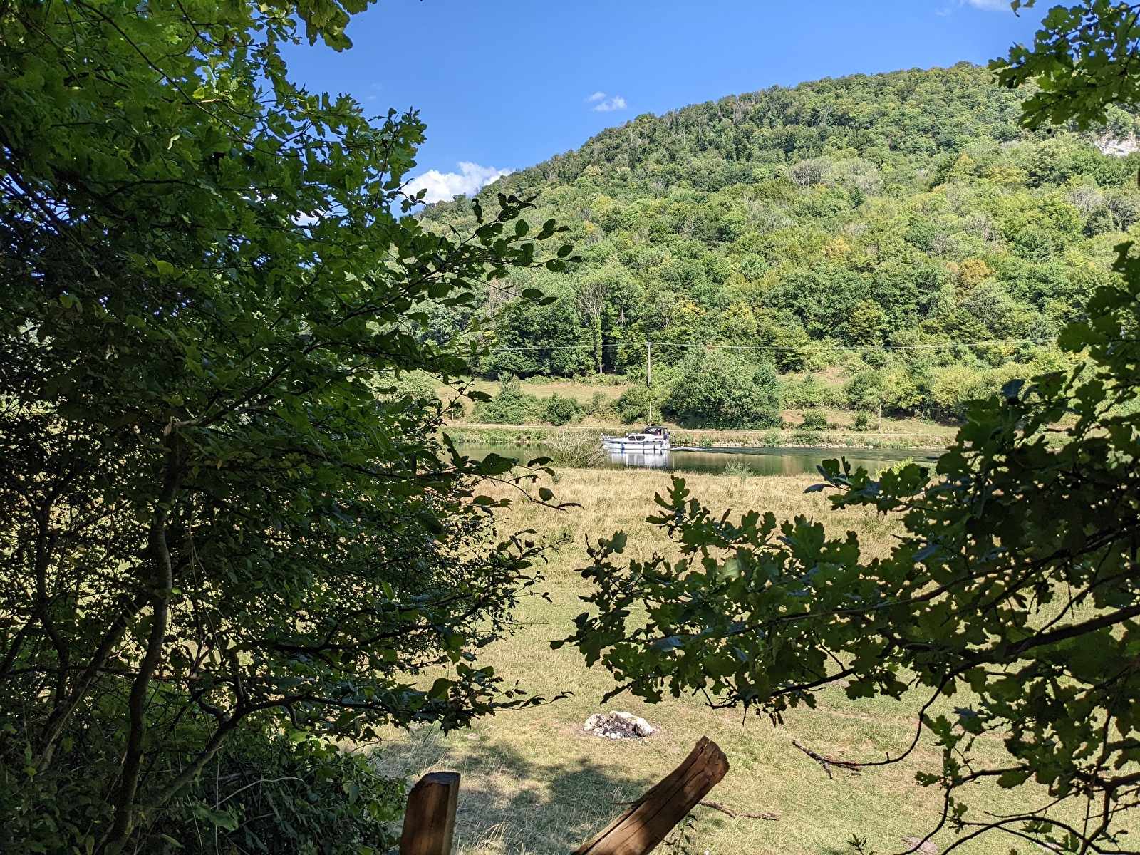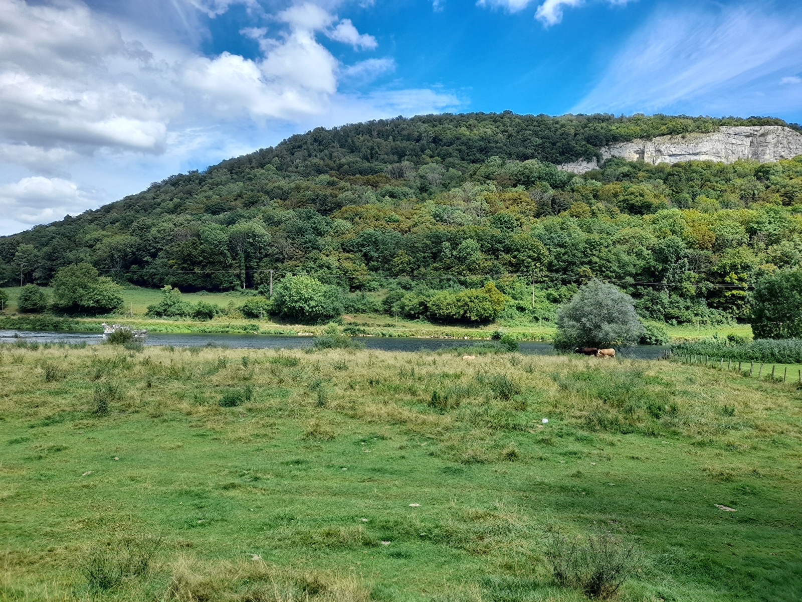 STAP 3 : Ga de weide in aan het rode draaihekje. Steek het weiland over langs de klif. Aan je linkerkant zie je de Rocher de Sous Buen, een populaire klimplek. Misschien ontdek je zelfs een kleine grot bovenaan de ladder (je kinderen zijn jouw verantwoordelijkheid). Ga verder langs de oevers van de Doubs tot je bij de D683 komt.