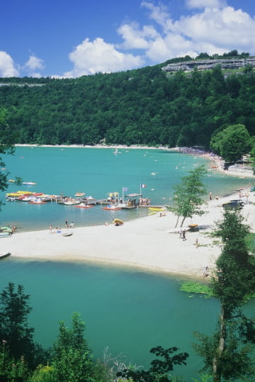 Met de auto naar de tropen reizen. Onmogelijk zeg je? Niet helemaal, want in hartje Jura ligt een meer dat zo blauw is dat je voor een dag (of meer) even vergeet dat je gewoon in Frankrijk bent. Het Lac de Chalain, een van de grootste natuurlijke meren van Frankrijk, biedt 3 strandjes en een fantastische gelegenheid om bij te tanken.