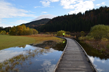 Running sur la passerelle en bois du lac de Lamoura à l'automne